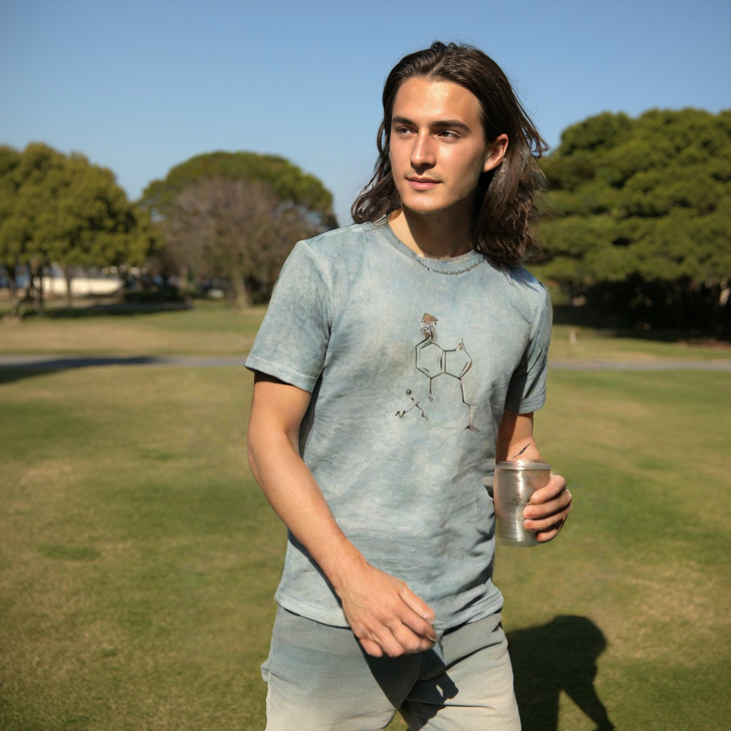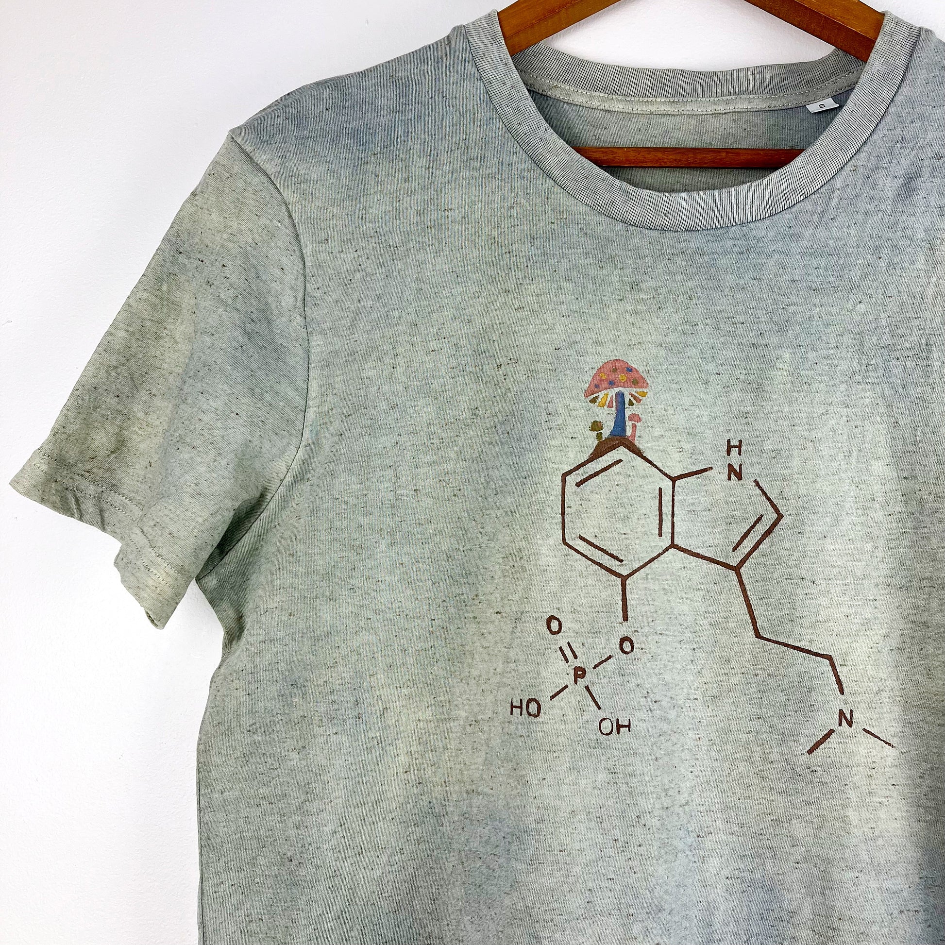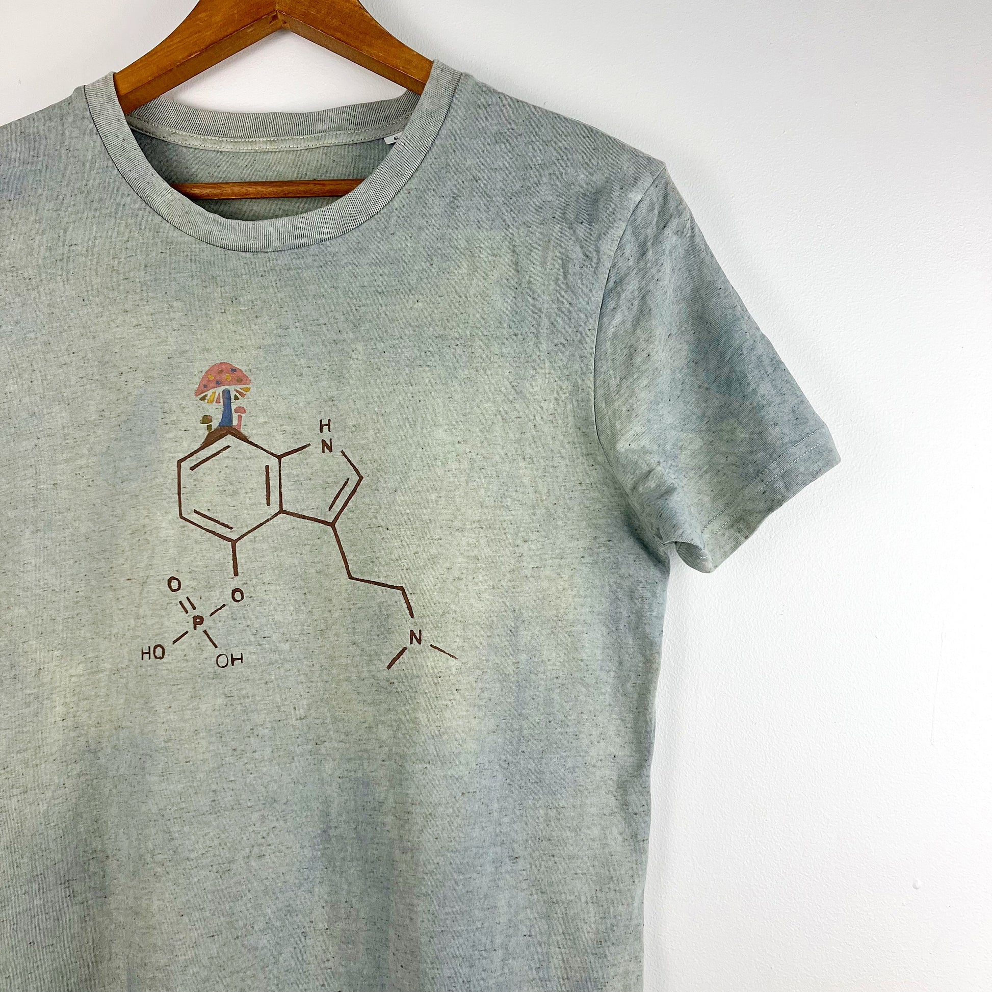 Our "Structure of Psilocybin" T-shirt features the intricate design of this mind-bending compound, hand-dyed with natural imperfections that celebrate the beauty of organic creation.